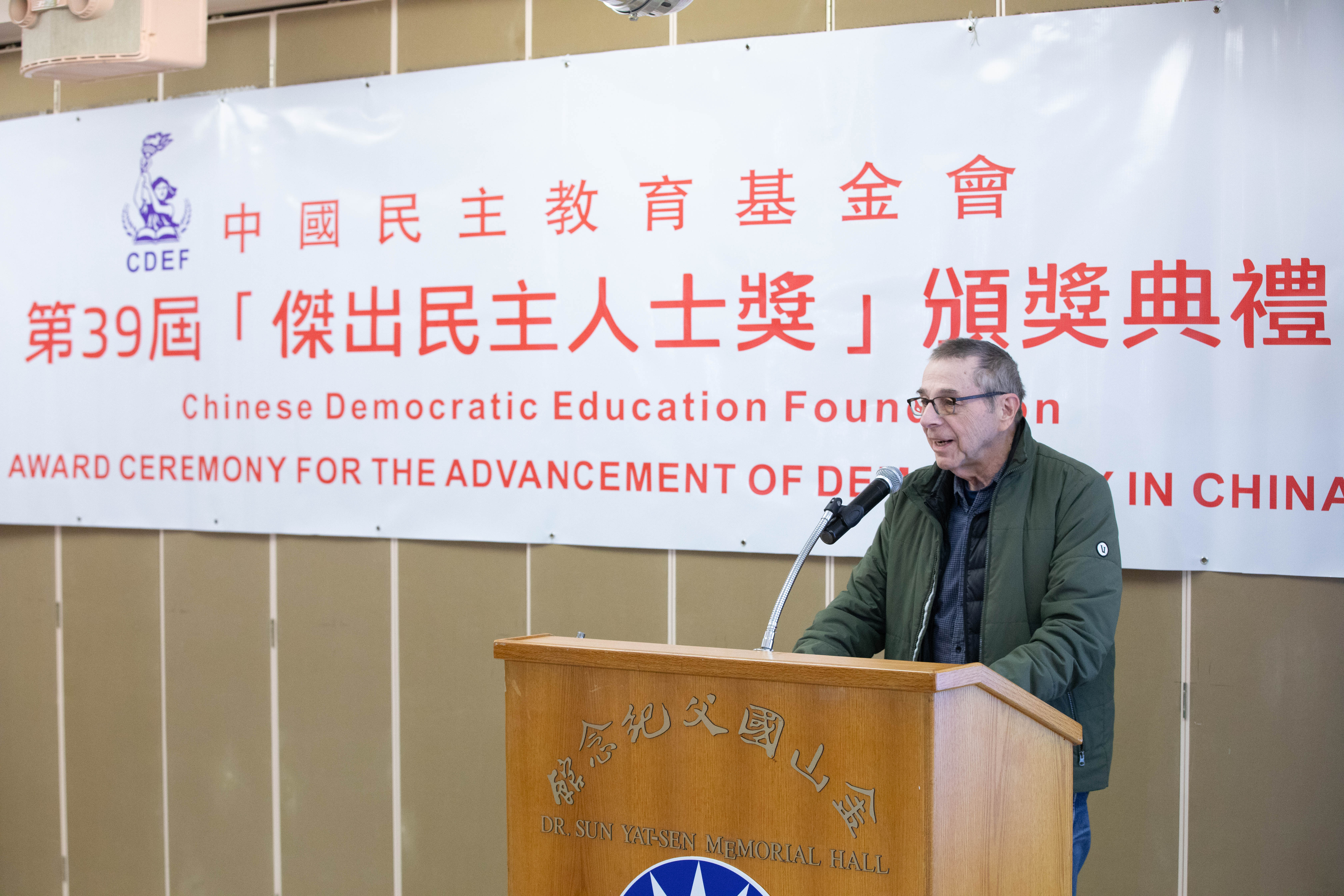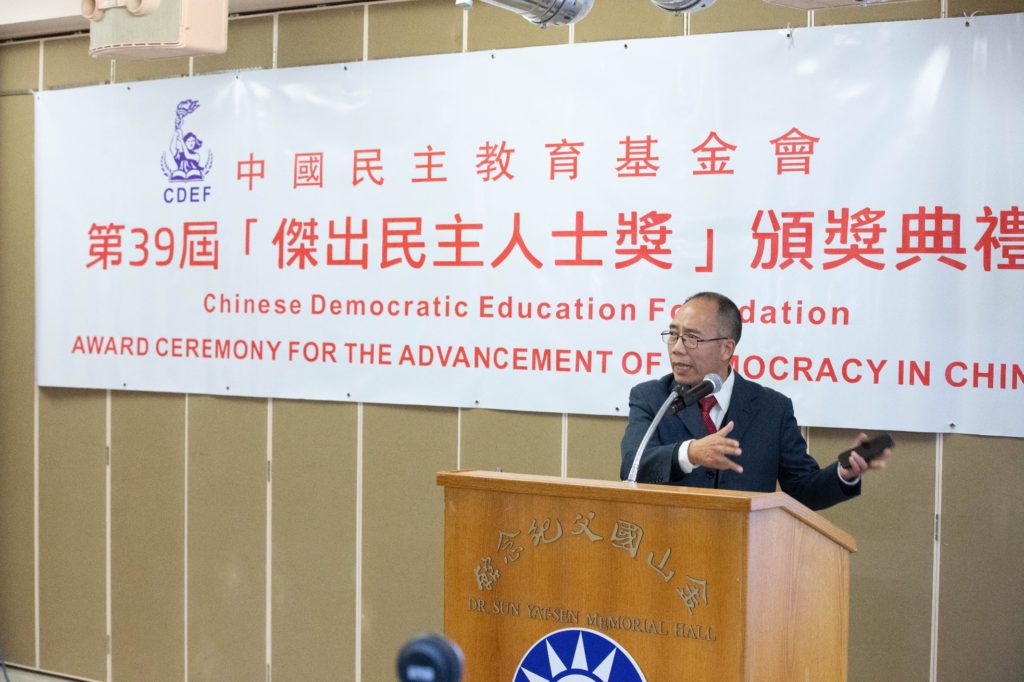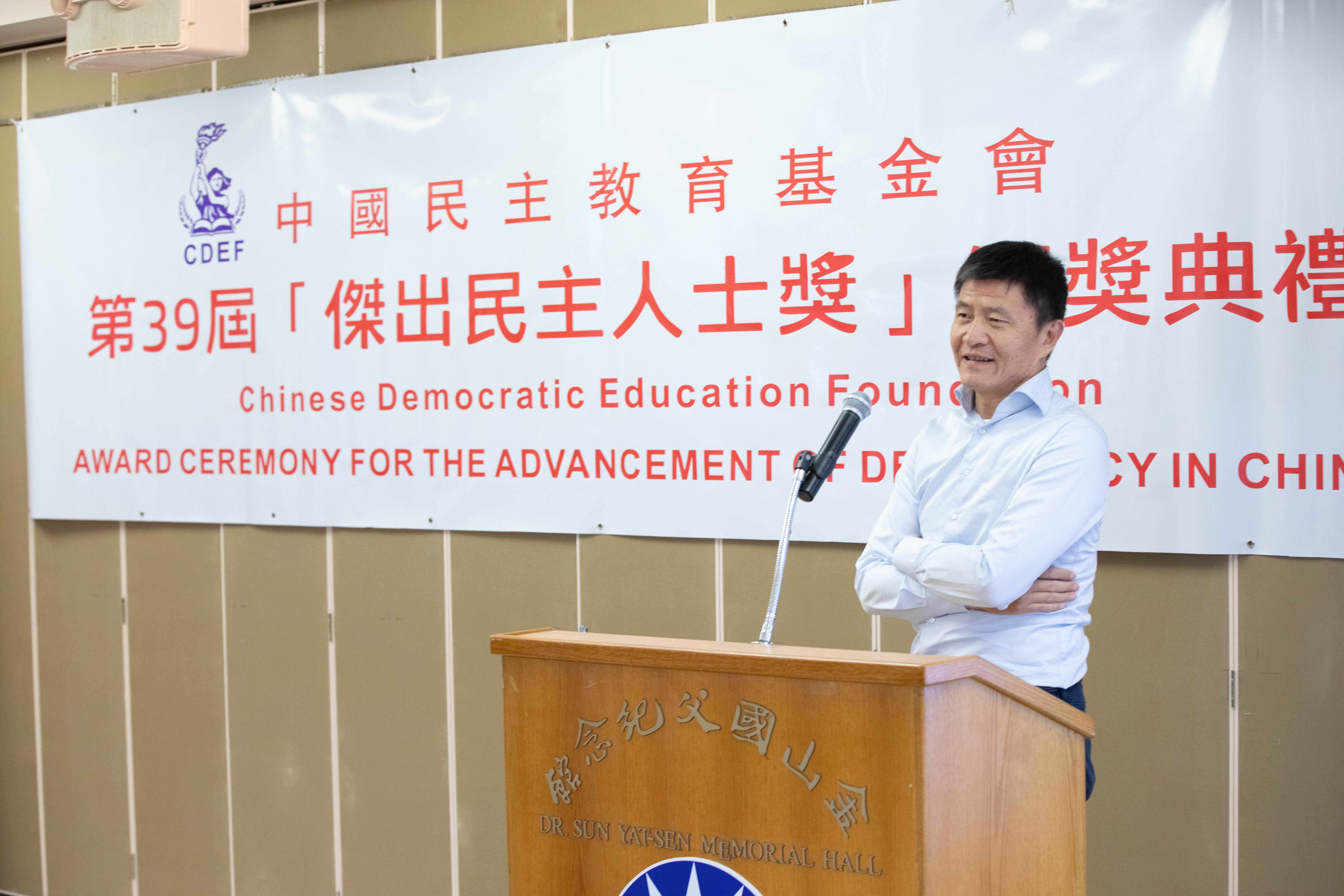 明居正教授通过电话连线的形式向大会现场发表了演讲,向中国民主教育基金会向他颁发的第三十九届「杰出民主人士奖」奖表示感谢。