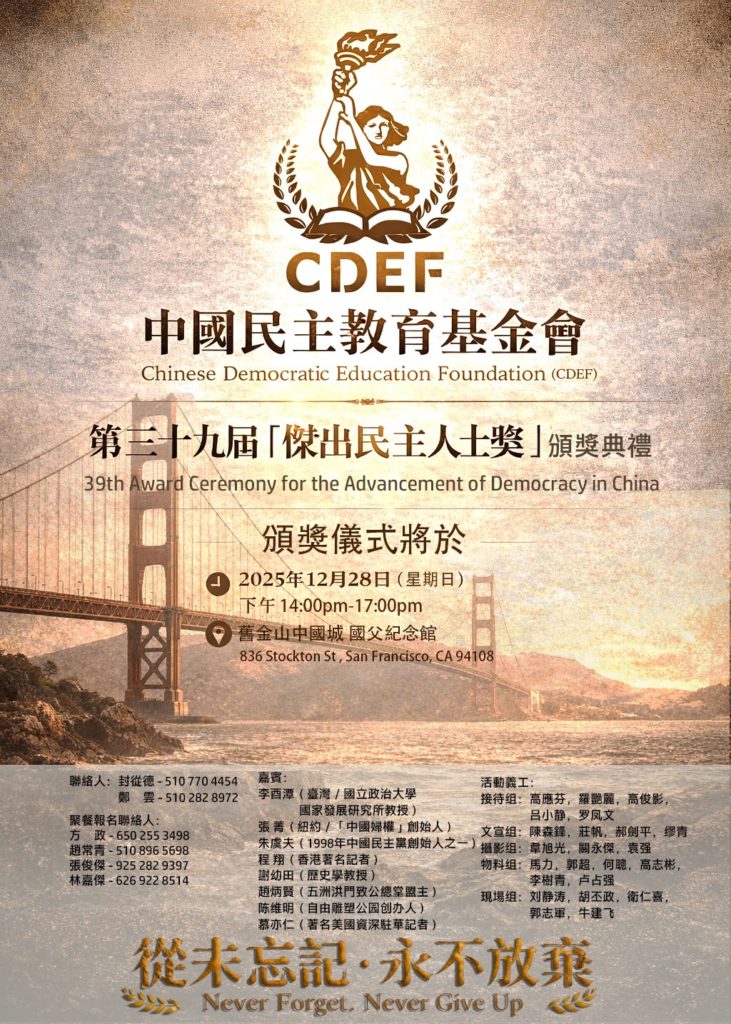 公告:【第三十九屆中國民主教育基金會「傑出民主人士獎」年度頒獎典禮】
